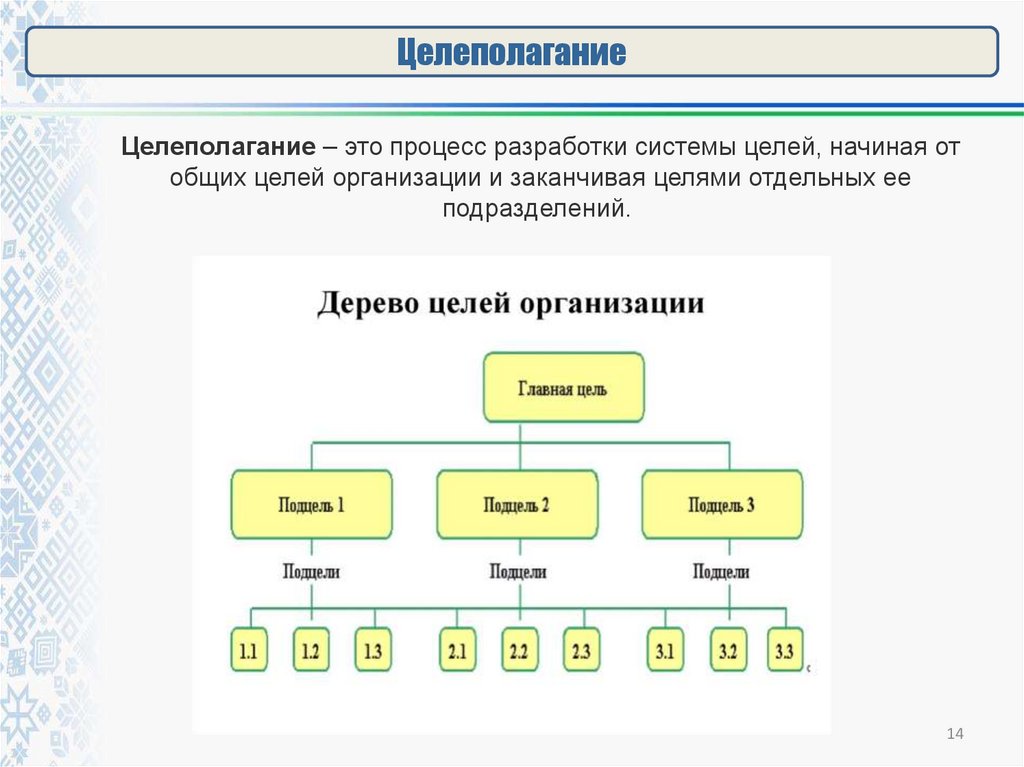 ЦелеполаганиеЦелеполагание – это процесс разработки системы целей, начиная от