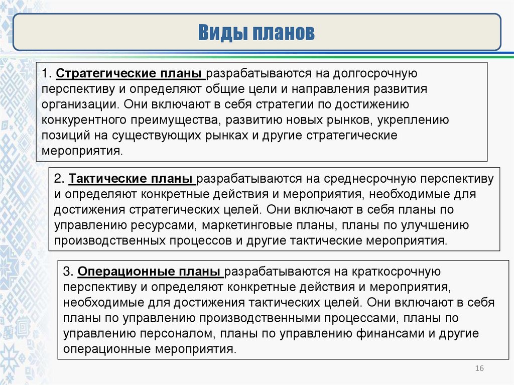 Виды планов1. Стратегические планы разрабатываются на долгосрочную