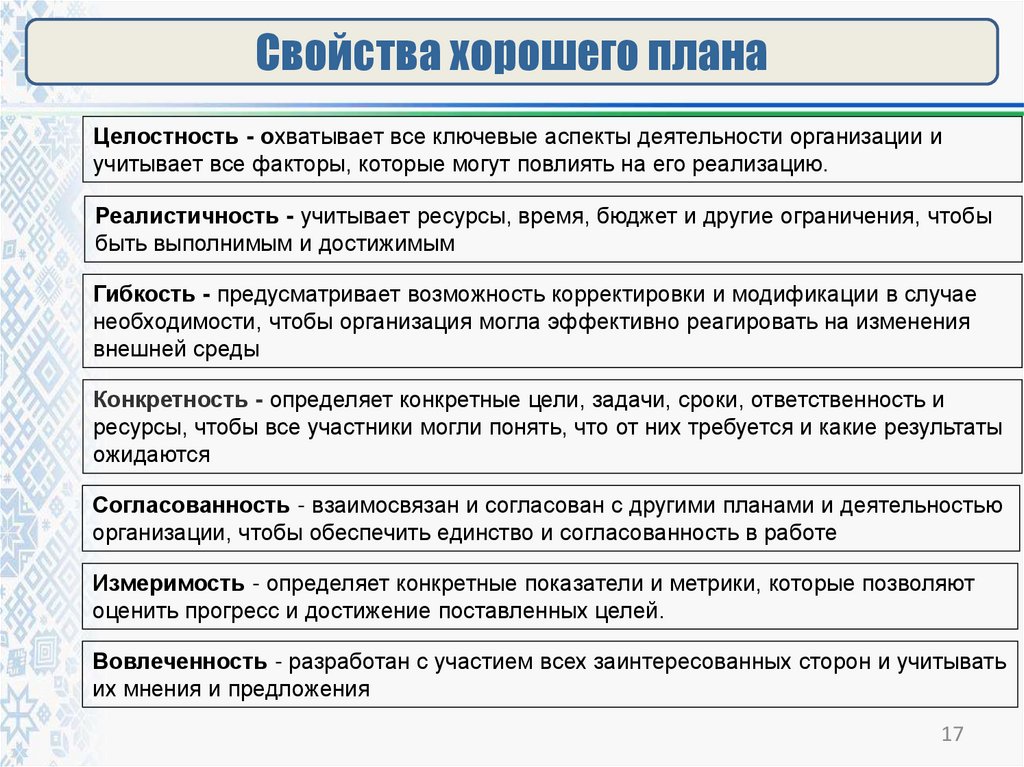 Свойства хорошего планаЦелостность - охватывает все ключевые аспекты деятельности организации и