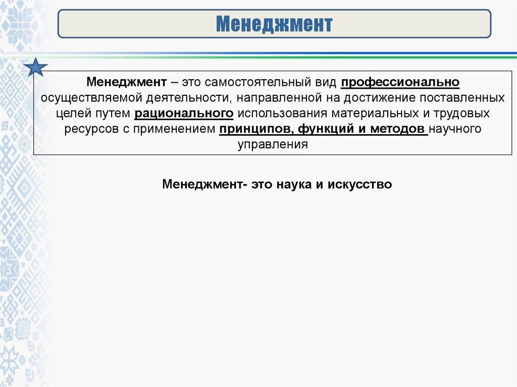 МенеджментМенеджмент – это самостоятельный вид профессионально