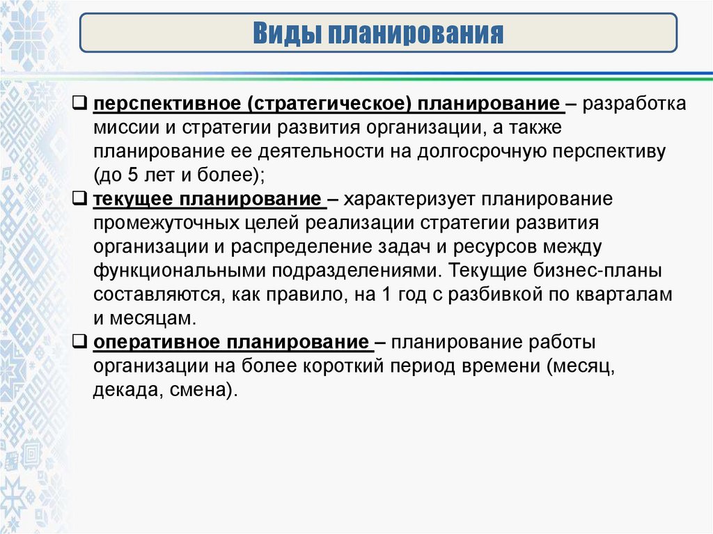 Виды планированияперспективное (стратегическое) планирование – разработка