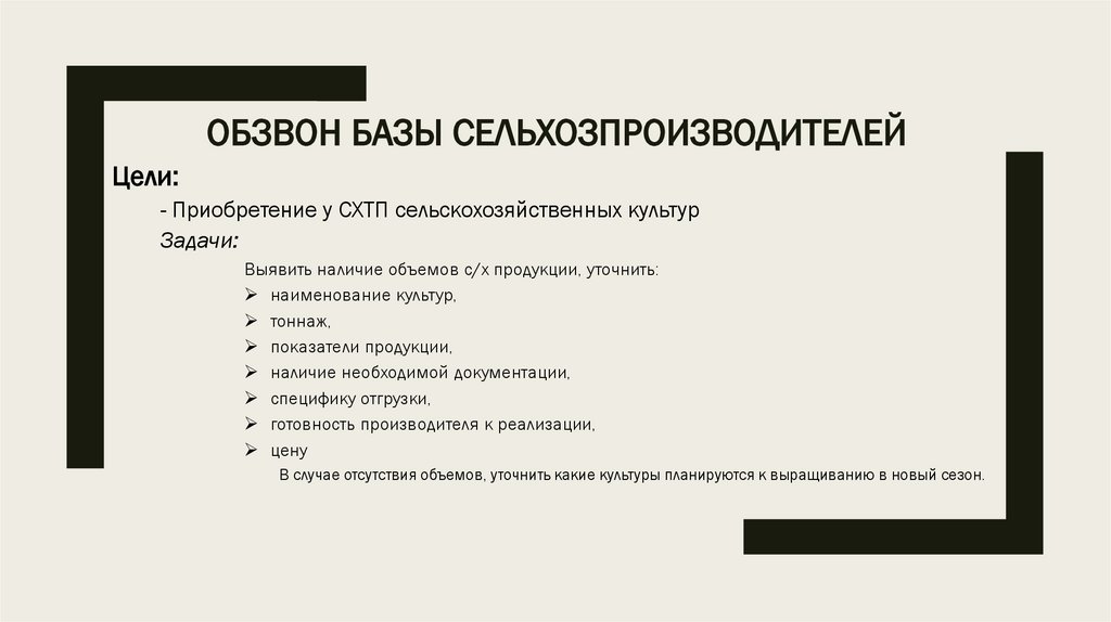 ОБЗВОН БАЗЫ СЕЛЬХОЗПРОИЗВОДИТЕЛЕЙЦели: