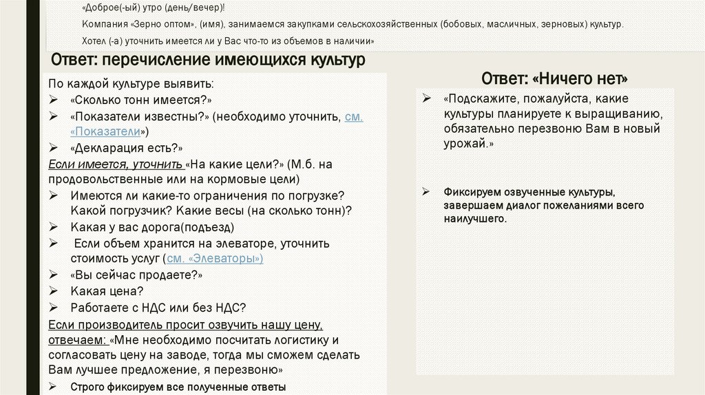 «Доброе(-ый) утро (день/вечер)!Компания «Зерно оптом», (имя), занимаемся закупками сельскохозяйственных (бобовых, масличных, зерновых) культур.