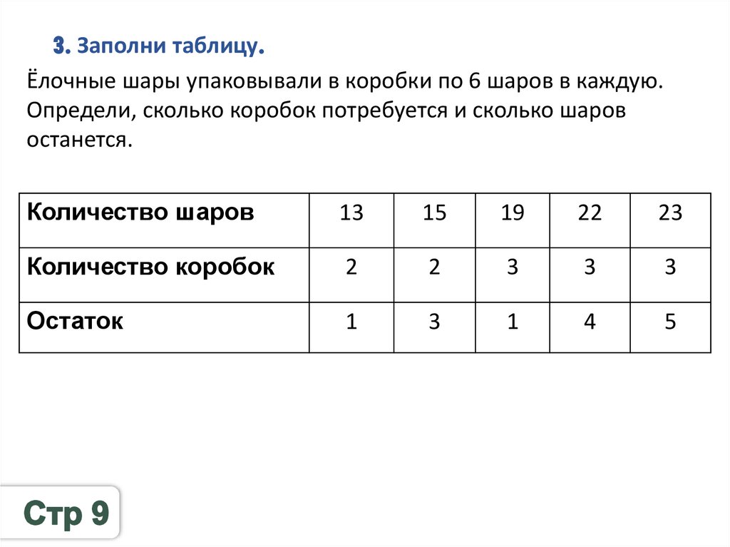 3. Заполни таблицу.Ёлочные шары упаковывали в коробки по 6 шаров в каждую.