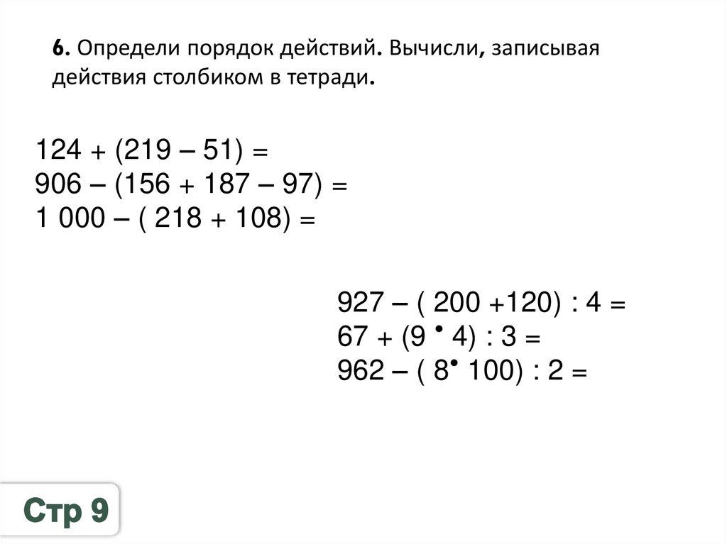 6. Определи порядок действий. Вычисли, записываядействия столбиком в тетради.