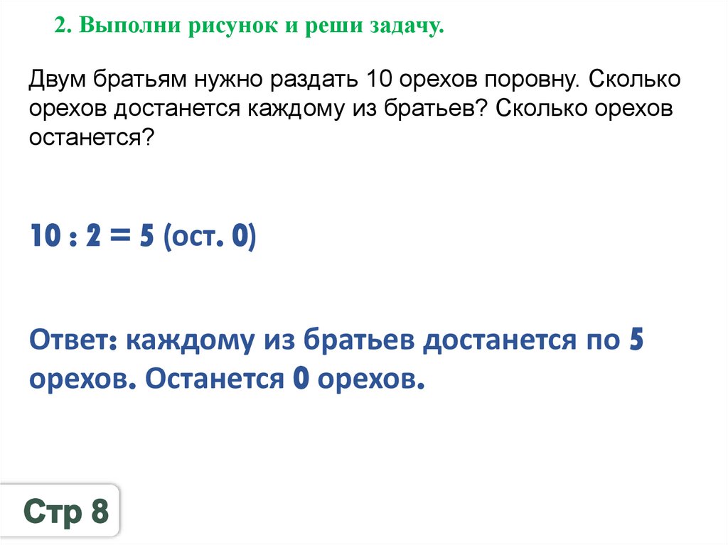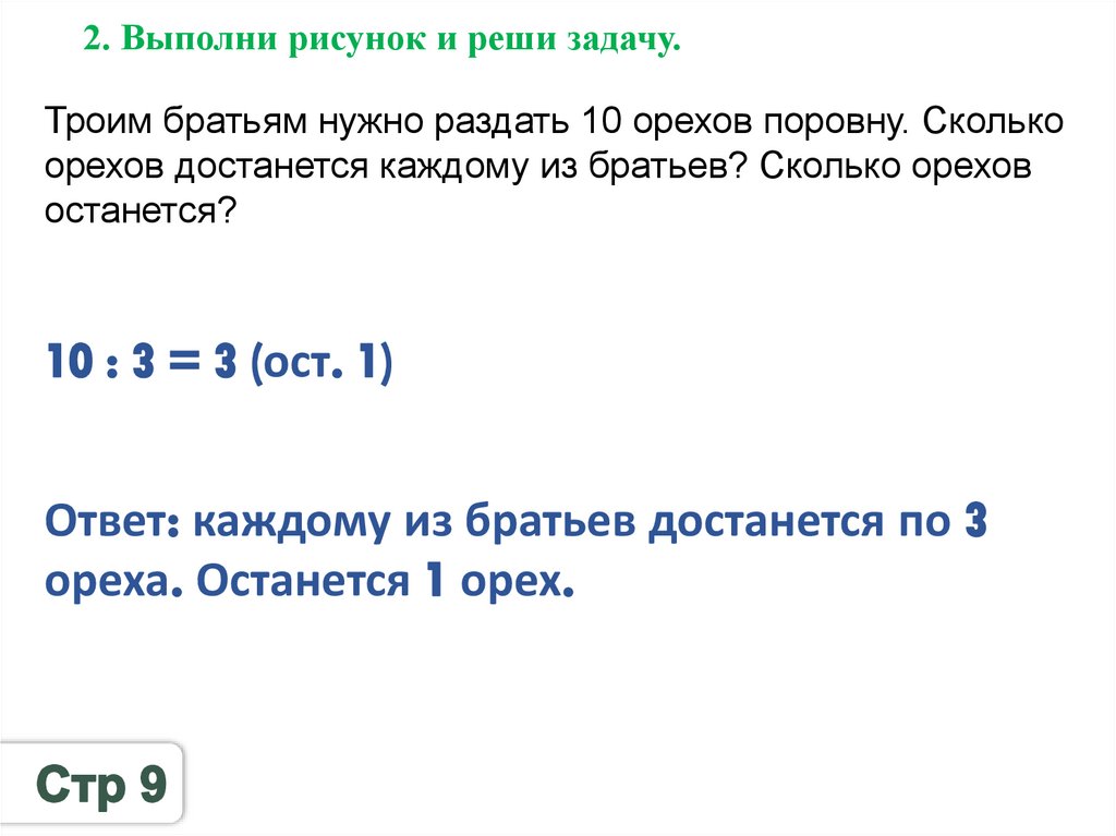 2. Выполни рисунок и реши задачу.Троим братьям нужно раздать 10 орехов поровну. Сколько