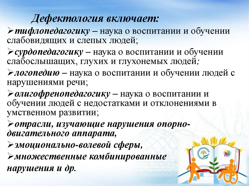 Дефектология включает:тифлопедагогику – наука о воспитании и обучении