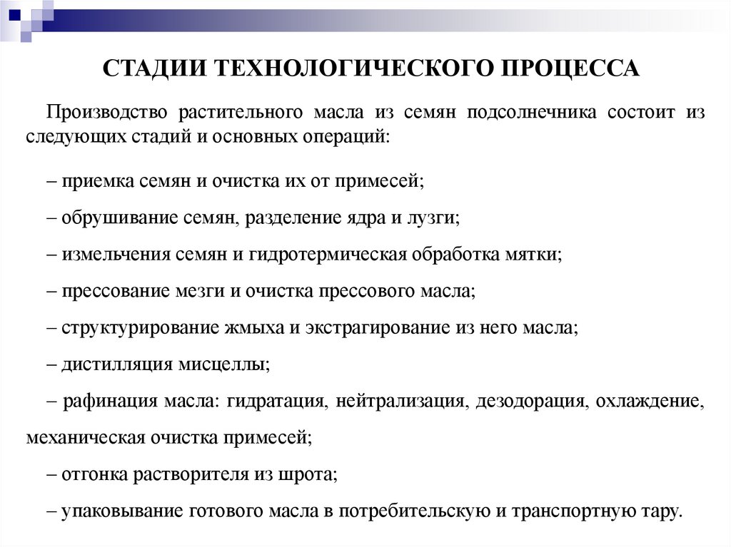 СТАДИИ ТЕХНОЛОГИЧЕСКОГО ПРОЦЕССАПроизводство растительного масла из семян подсолнечника состоит из