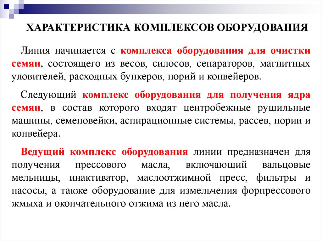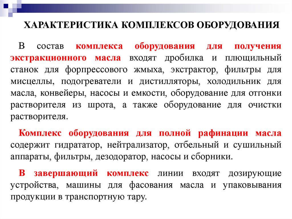 Характеристика комплексов оборудования.