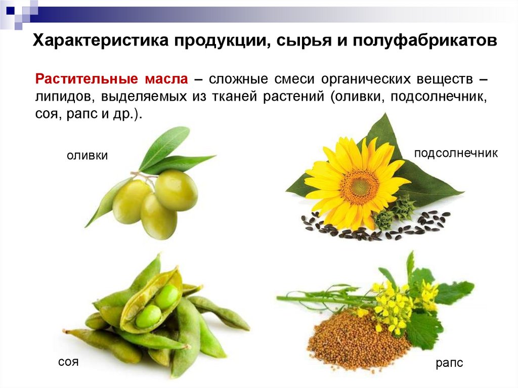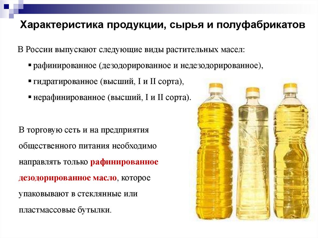 Характеристика продукции, сырья и полуфабрикатовВ России выпускают следующие виды растительных масел: