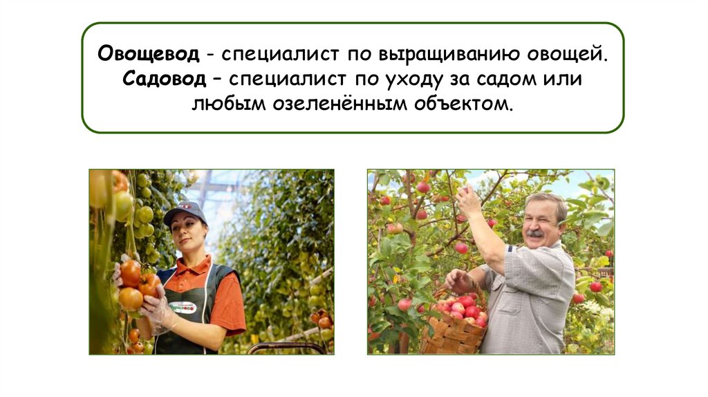Овощевод - специалист по выращиванию овощей.Садовод – специалист по уходу за садом или