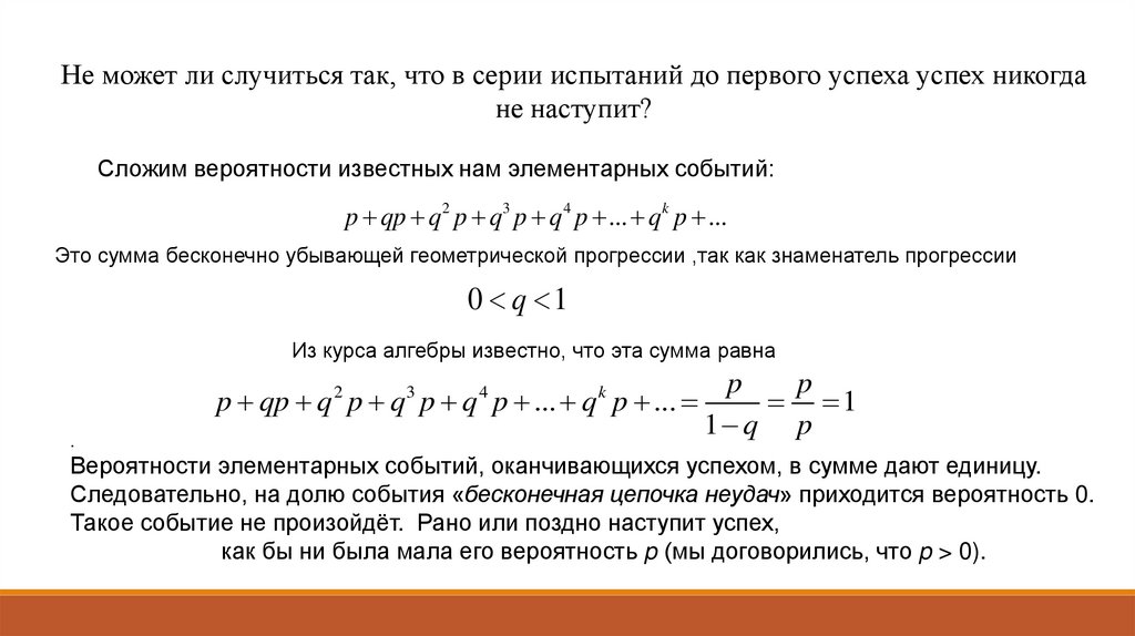 Не может ли случиться так, что в серии испытаний до первого успеха успех никогдане наступит?
