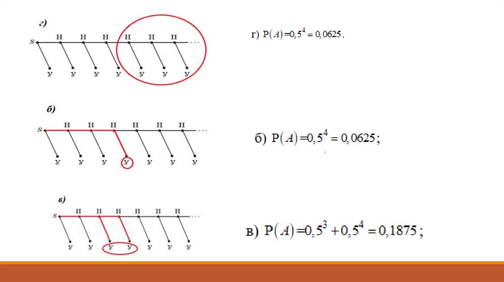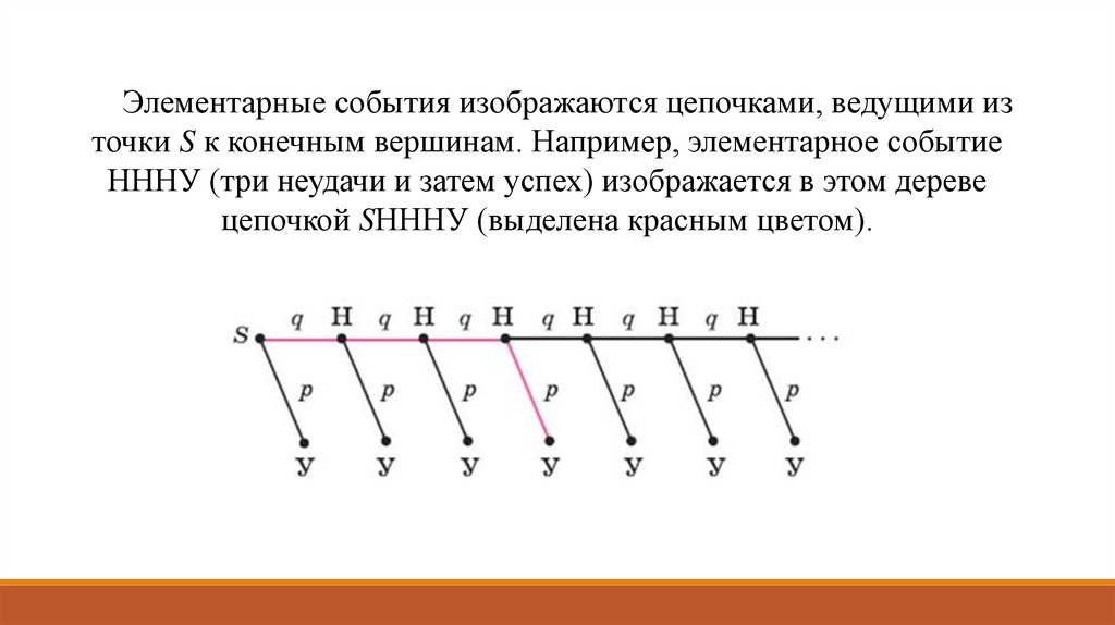 Элементарные события изображаются цепочками, ведущими източки S к конечным вершинам. Например, элементарное событие
