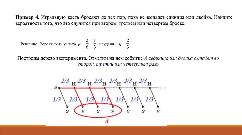 Пример 4. Игральную кость бросают до тех пор, пока не выпадет единица или двойка. Найдитевероятность того, что это случится при втором, третьем или четвёртом броске.