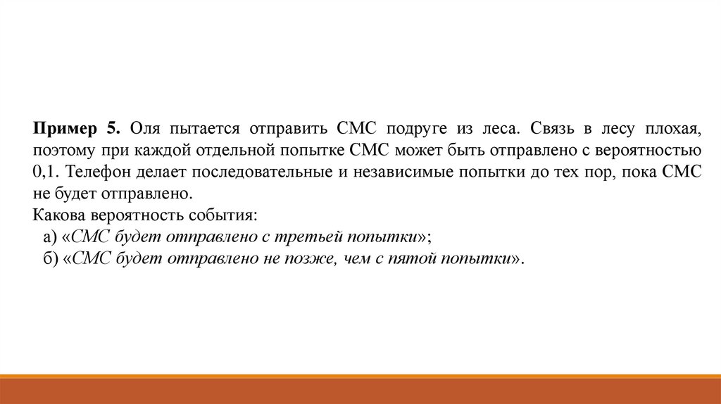 Пример 5. Оля пытается отправить СМС подруге из леса. Связь в лесу плохая,поэтому при каждой отдельной попытке СМС может быть отправлено с вероятностью
