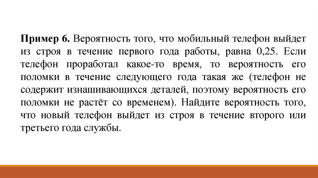 Пример 6. Вероятность того, что мобильный телефон выйдетиз строя в течение первого года работы, равна 0,25. Если