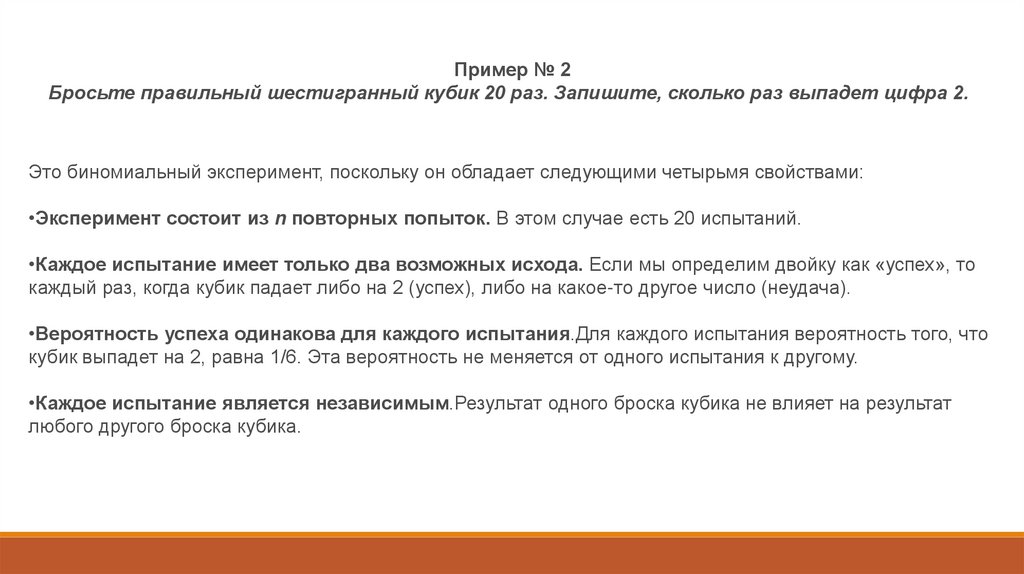 Пример № 2Бросьте правильный шестигранный кубик 20 раз. Запишите, сколько раз выпадет цифра 2.