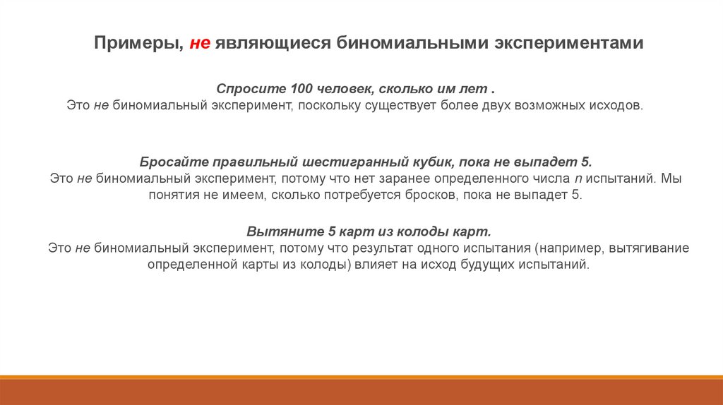 Примеры, не являющиеся биномиальными экспериментамиСпросите 100 человек, сколько им лет .