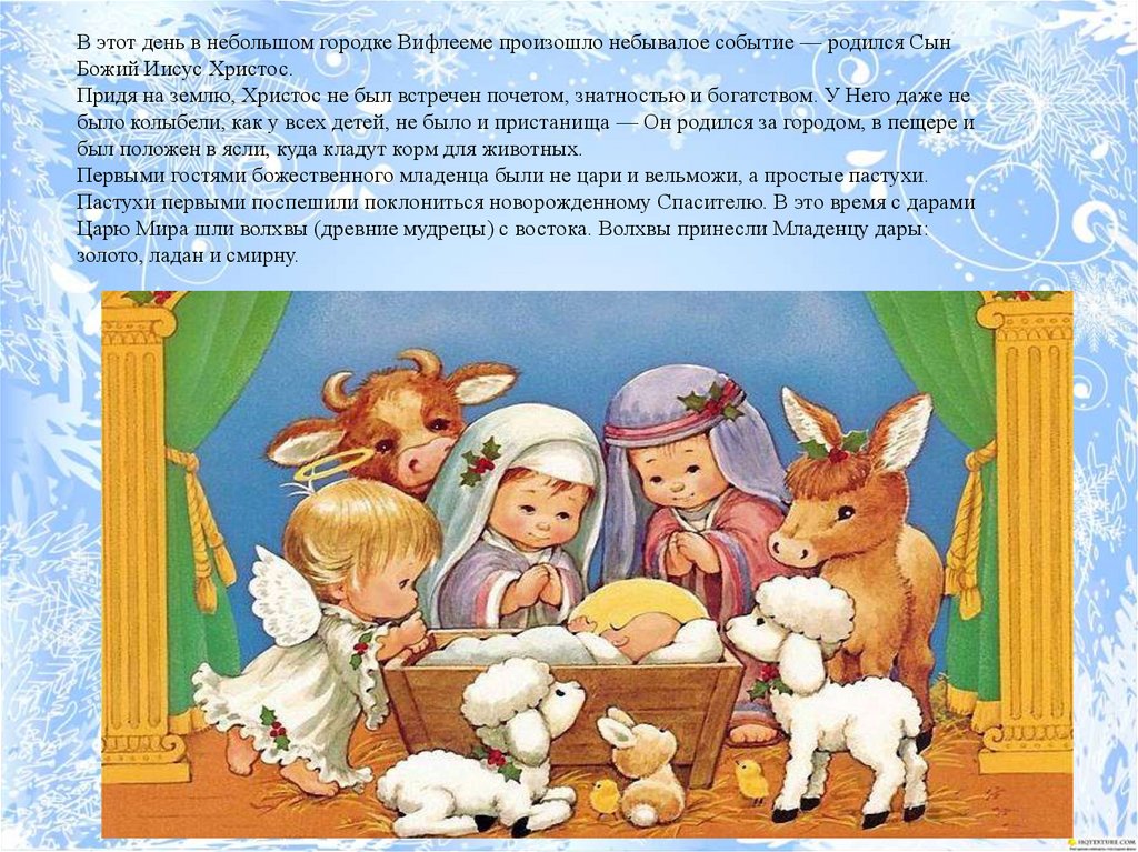 В этот день в небольшом городке Вифлееме произошло небывалое событие — родился СынБожий Иисус Христос.