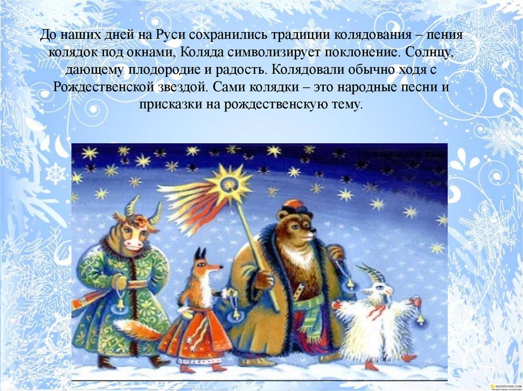 До наших дней на Руси сохранились традиции колядования – пенияколядок под окнами, Коляда символизирует поклонение. Солнцу,
