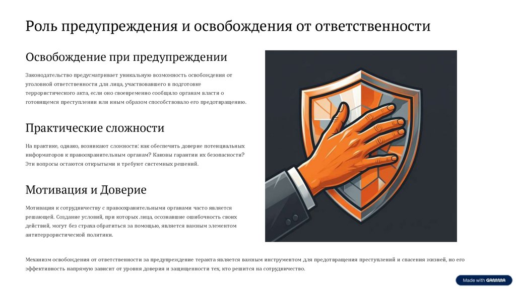Механизм освобождения от ответственности за предупреждение теракта является важным инструментом для предотвращения преступлений и спасения жизней, но его