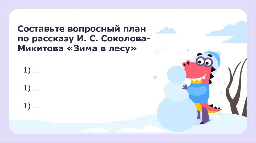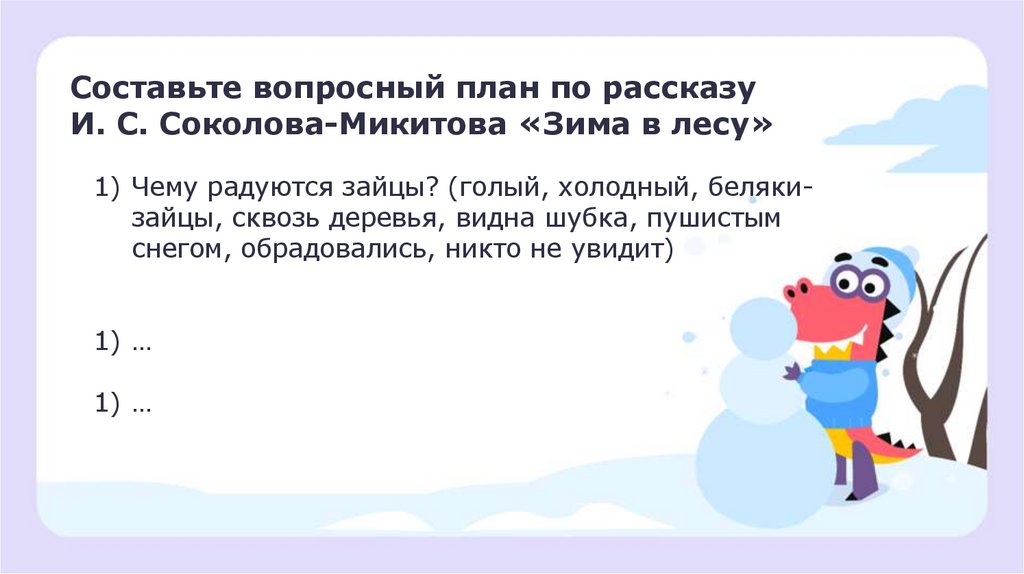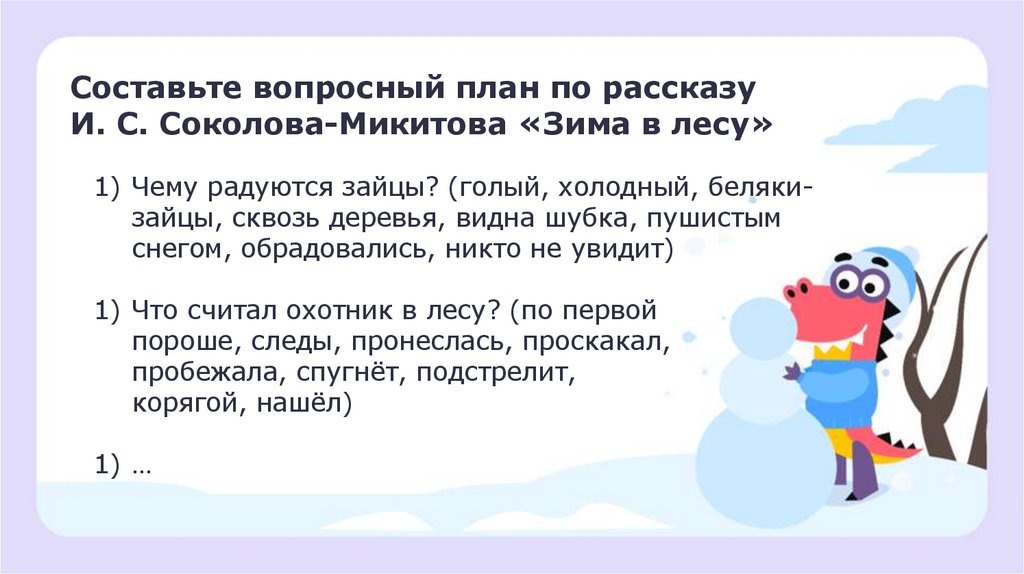 Составьте вопросный планпо рассказу И. С. СоколоваМикитова «Зима в лесу»