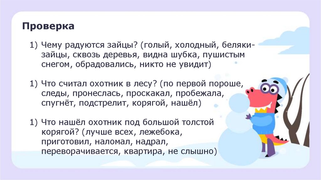Проверка1) Чему радуются зайцы? (голый, холодный, белякизайцы, сквозь деревья, видна шубка, пушистым
