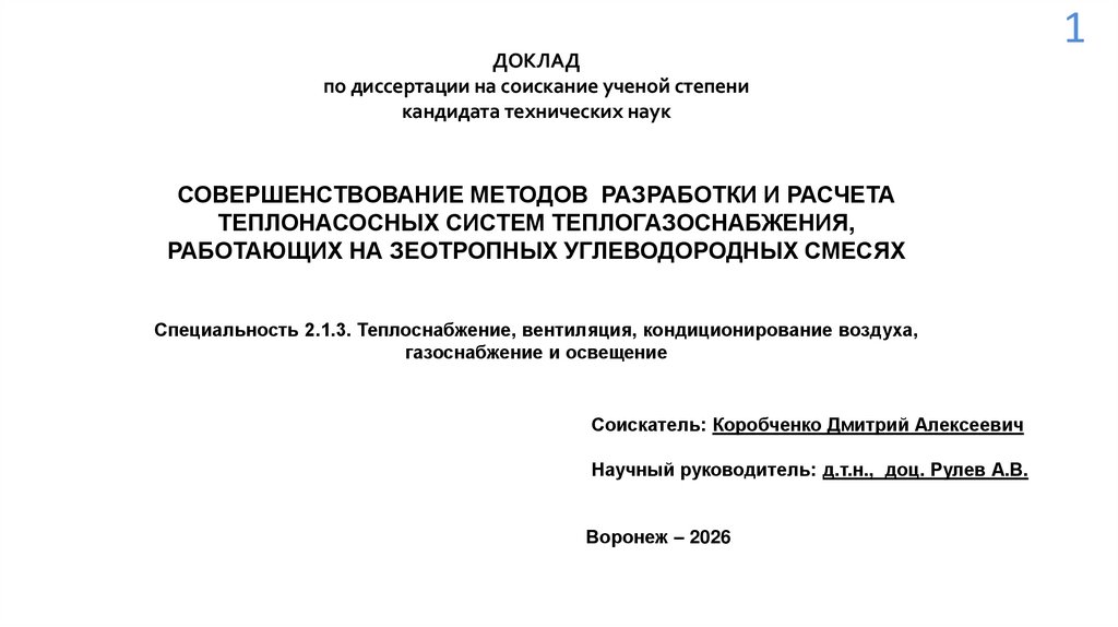 1. Соискатель: Коробченко Дмитрий Алексеевич Научный руководитель: д.т.н., доц. Рулев А.В. Воронеж – 2026