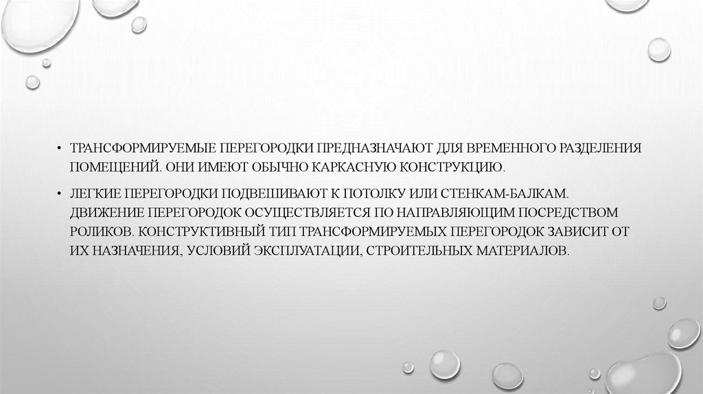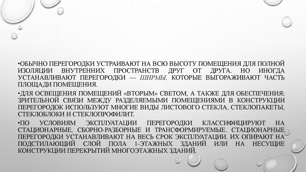 •ОБЫЧНО ПЕРЕГОРОДКИ УСТРАИВАЮТ НА ВСЮ ВЫСОТУ ПОМЕЩЕНИЯ ДЛЯ ПОЛНОЙИЗОЛЯЦИИ ВНУТРЕННИХ ПРОСТРАНСТВ ДРУГ ОТ ДРУГА. НО ИНОГДА