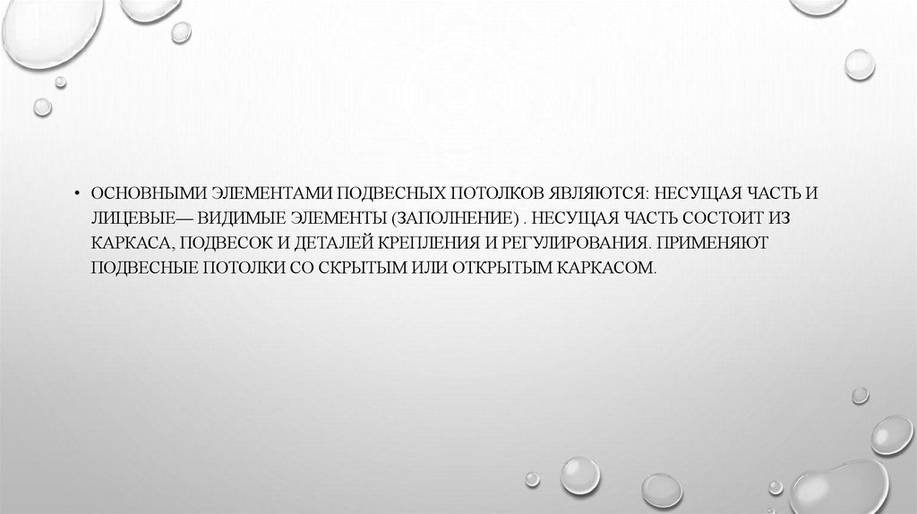 • ОСНОВНЫМИ ЭЛЕМЕНТАМИ ПОДВЕСНЫХ ПОТОЛКОВ ЯВЛЯЮТСЯ: НЕСУЩАЯ ЧАСТЬ ИЛИЦЕВЫЕ— ВИДИМЫЕ ЭЛЕМЕНТЫ (ЗАПОЛНЕНИЕ) . НЕСУЩАЯ ЧАСТЬ СОСТОИТ ИЗ
