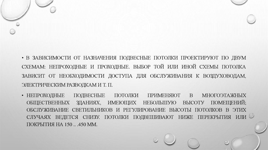 • В ЗАВИСИМОСТИ ОТ НАЗНАЧЕНИЯ ПОДВЕСНЫЕ ПОТОЛКИ ПРОЕКТИРУЮТ ПО ДВУМСХЕМАМ: НЕПРОХОДНЫЕ И ПРОХОДНЫЕ. ВЫБОР ТОЙ ИЛИ ИНОЙ СХЕМЫ ПОТОЛКА