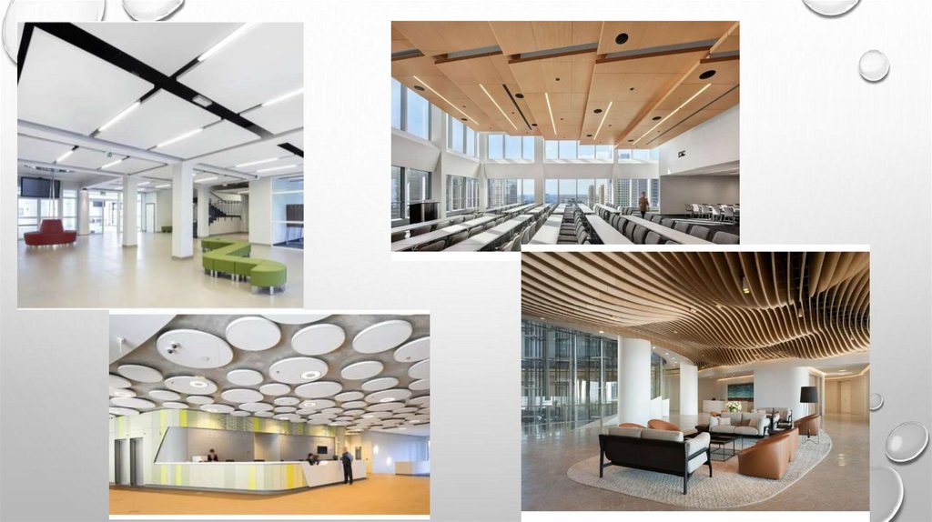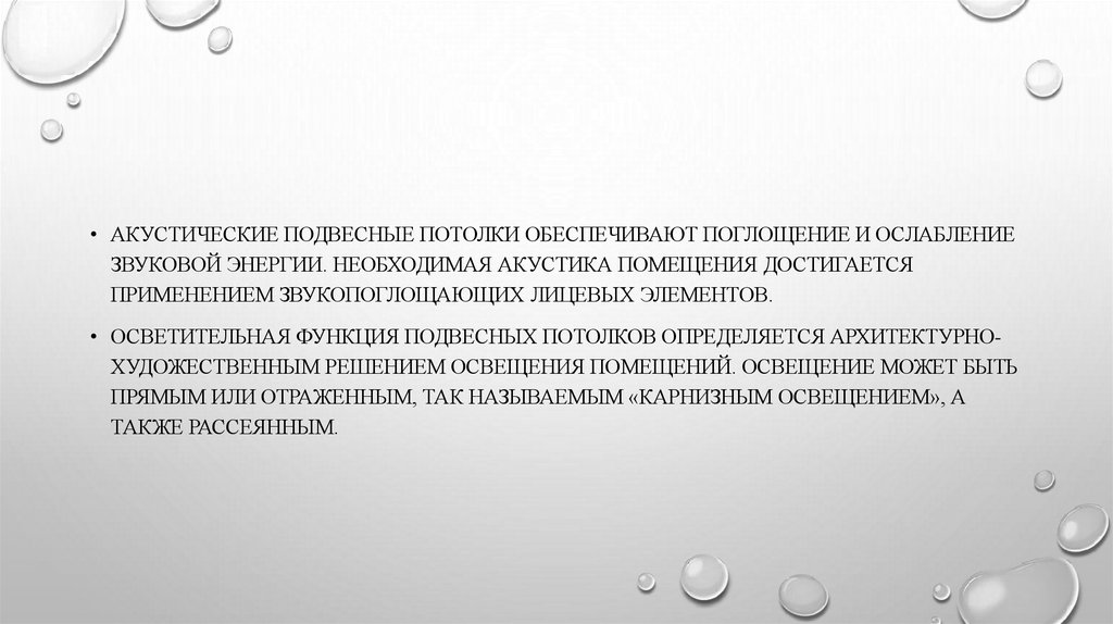 • ПОДВЕСНЫЕ ПОТОЛКИ ВЫПОЛНЯЮТ СЛЕДУЮЩИЕ ФУНКЦИИ: АКУСТИЧЕСКИЕ(ЗВУКОПОГЛОЩАЮЩИЕ ПОДВЕСНЫЕ ПОТОЛКИ); ОСВЕТИТЕЛЬНЫЕ (СВЕТЯЩИЕСЯ