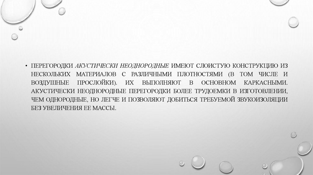 • ПЕРЕГОРОДКИ АКУСТИЧЕСКИ НЕОДНОРОДНЫЕ ИМЕЮТ СЛОИСТУЮ КОНСТРУКЦИЮ ИЗНЕСКОЛЬКИХ МАТЕРИАЛОВ С РАЗЛИЧНЫМИ ПЛОТНОСТЯМИ (В ТОМ ЧИСЛЕ И