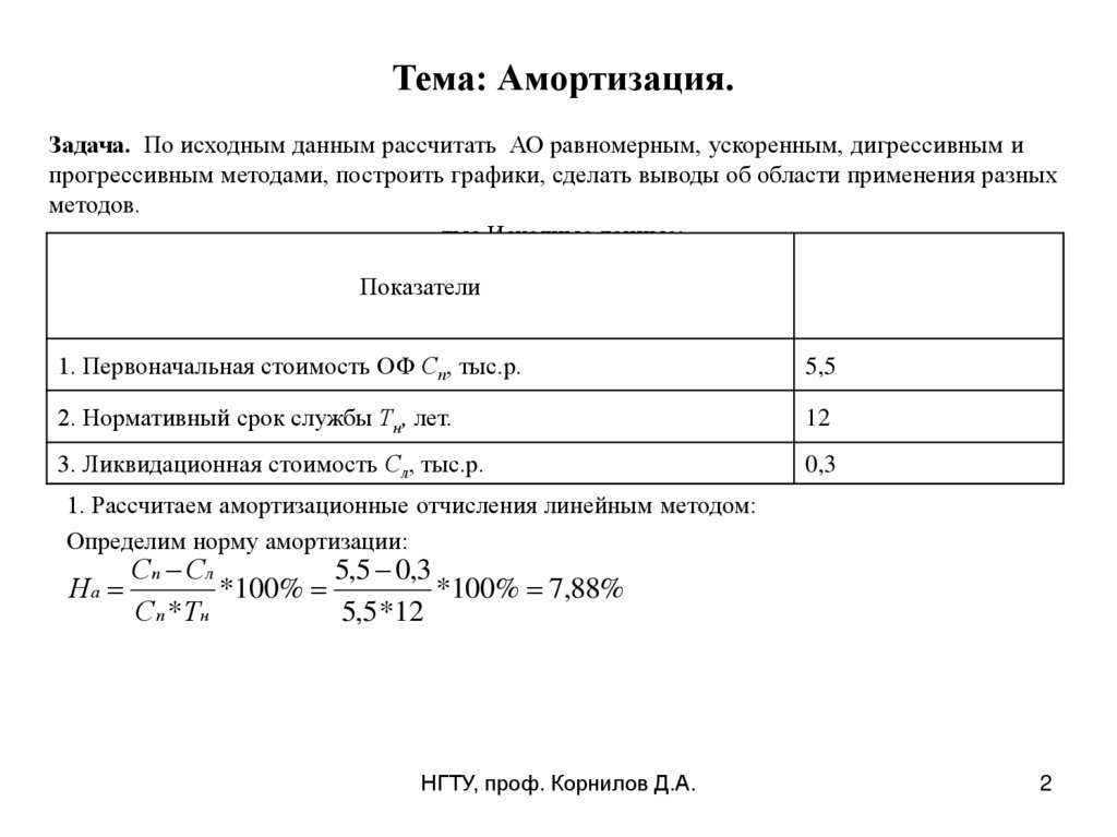 Тема: Амортизация.Задача. По исходным данным рассчитать АО равномерным, ускоренным, дигрессивным и