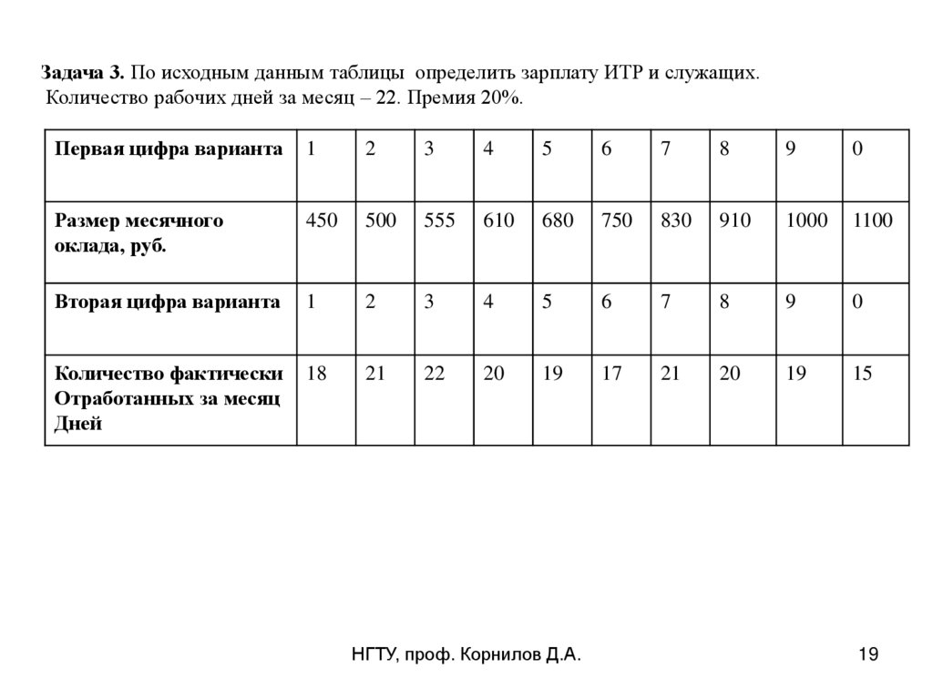 Задача 3. Определить зарплату ИТР и служащих. Количество рабочих дней за месяц – 22.