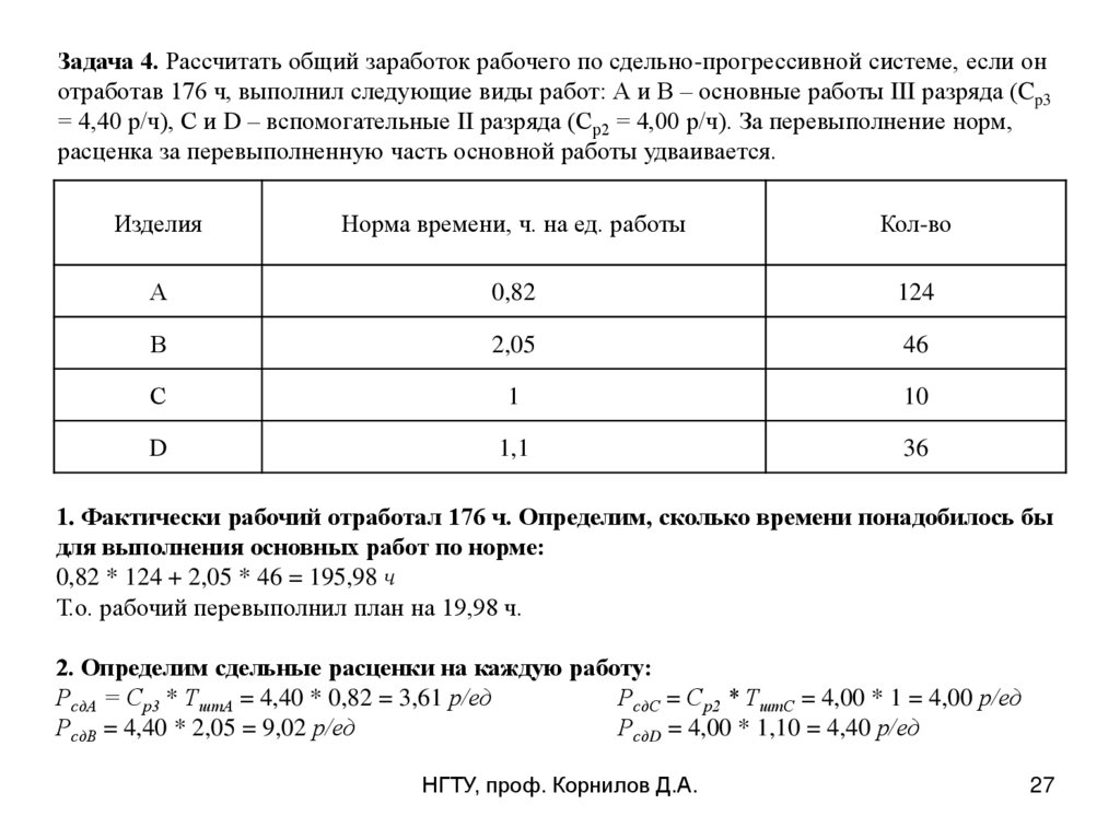 = 4,40 р/ч), С и D – вспомогательные II разряда (Ср2 = 4,00 р/ч). За перевыполнение норм,