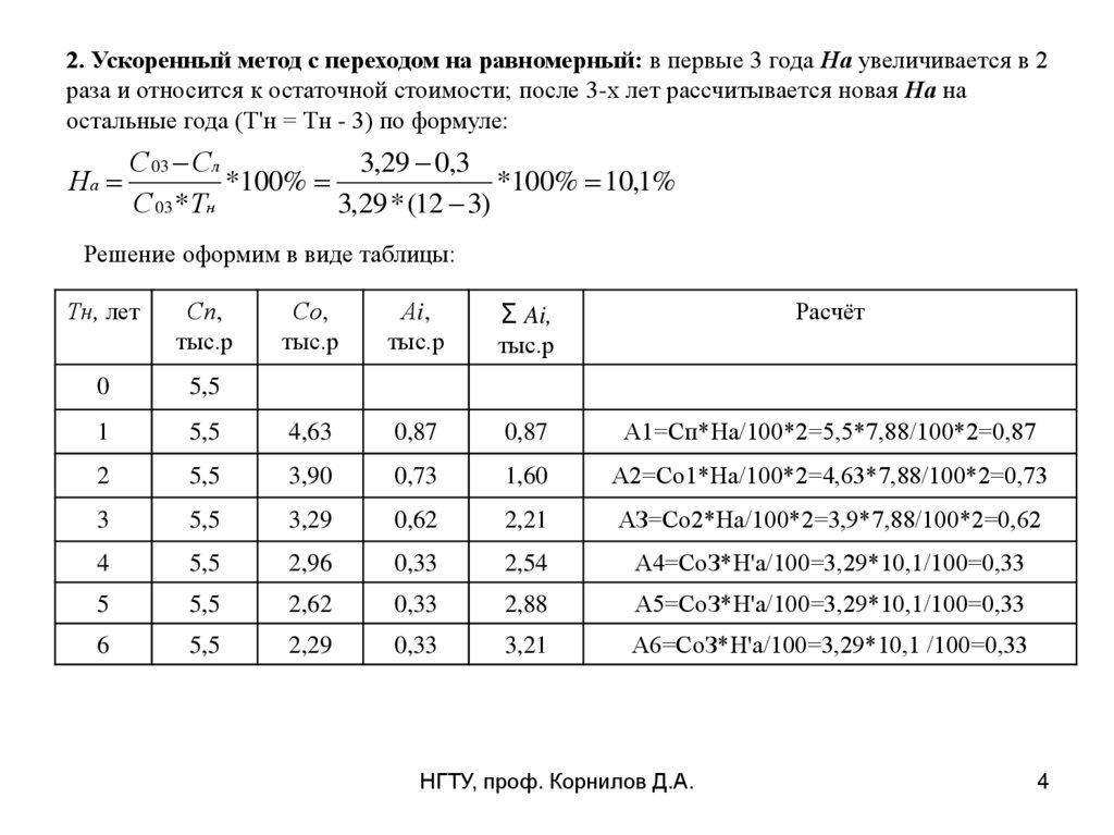 2. Ускоренный метод с переходом на равномерный: в первые 3 года На увеличивается в 2раза и относится к остаточной стоимости; после 3-х лет рассчитывается новая На на
