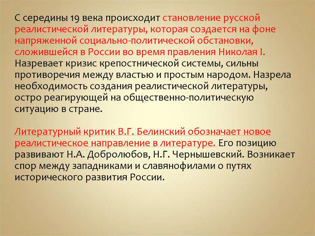 С середины 19 века происходит становление русскойреалистической литературы, которая создается на фоне