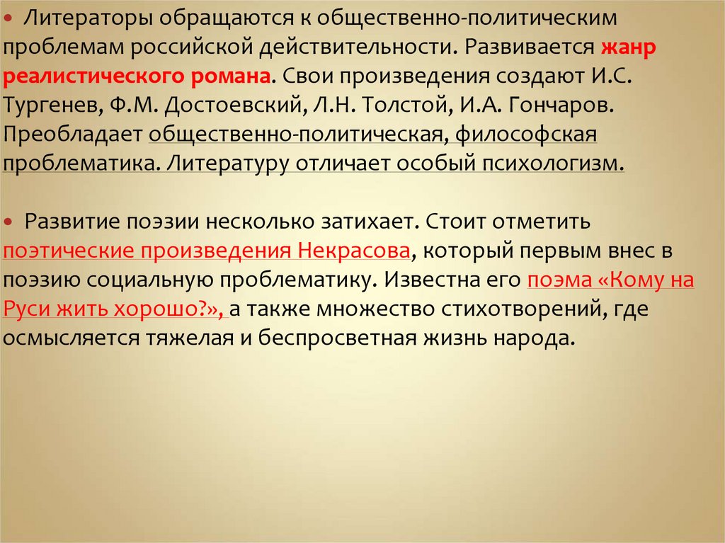 Тургенев, Ф.М. Достоевский, Л.Н. Толстой, И.А. Гончаров.