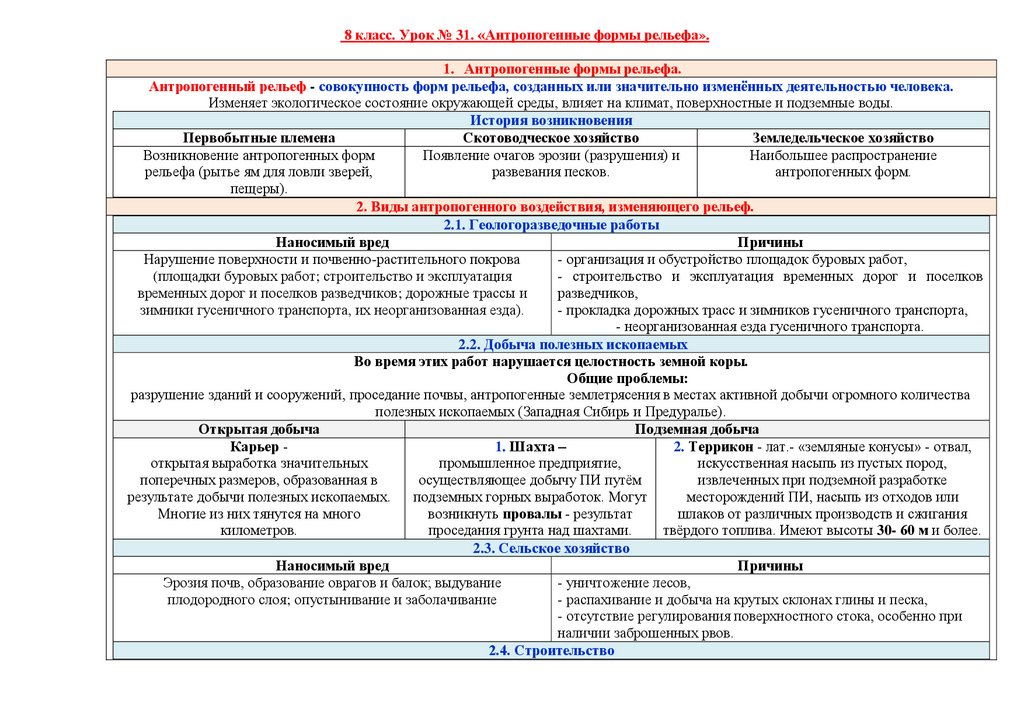 8 класс. Урок № 31. «Антропогенные формы рельефа».1. Антропогенные формы рельефа.