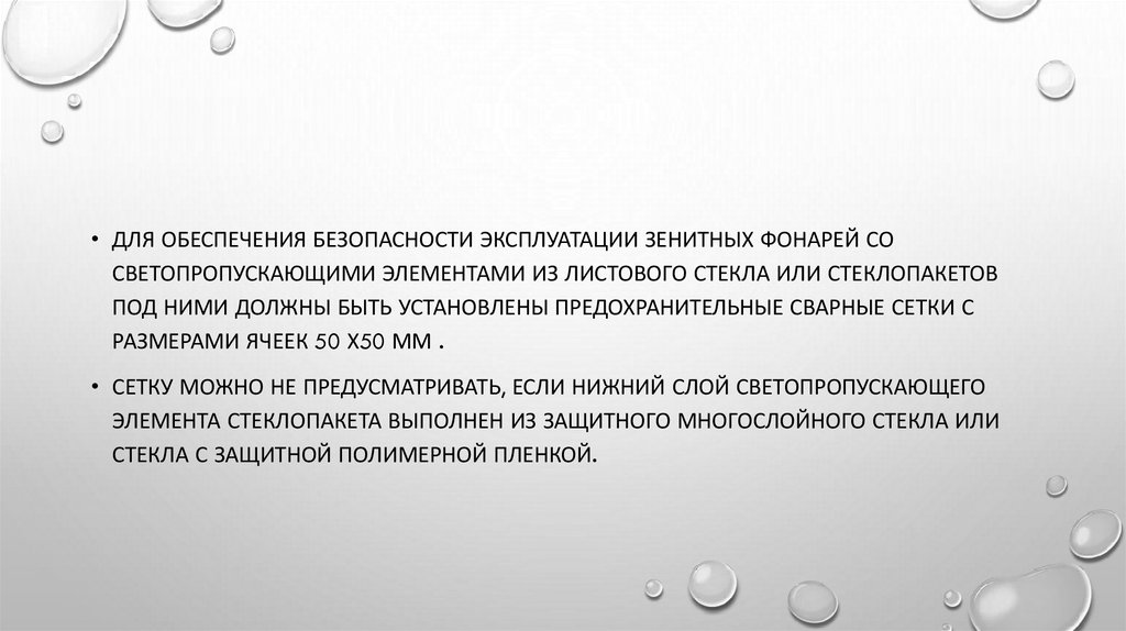 • ДЛЯ ОБЕСПЕЧЕНИЯ БЕЗОПАСНОСТИ ЭКСПЛУАТАЦИИ ЗЕНИТНЫХ ФОНАРЕЙ СОСВЕТОПРОПУСКАЮЩИМИ ЭЛЕМЕНТАМИ ИЗ ЛИСТОВОГО СТЕКЛА ИЛИ СТЕКЛОПАКЕТОВ