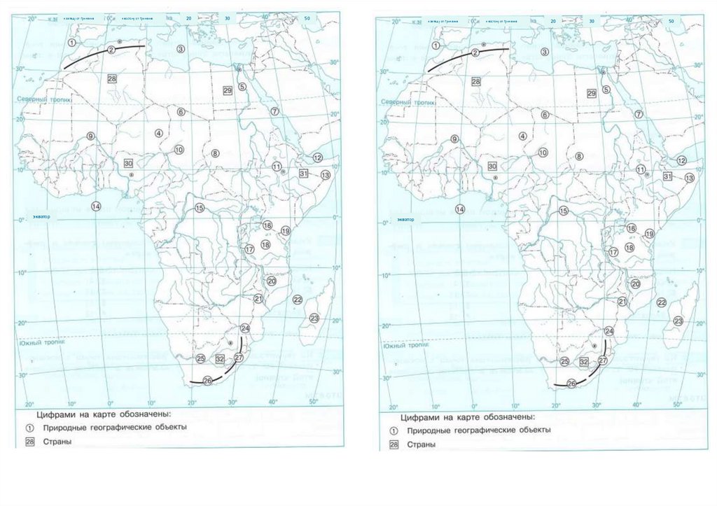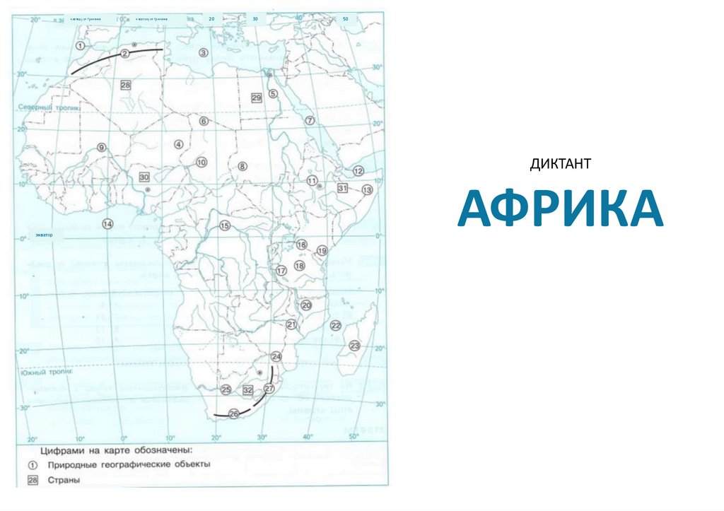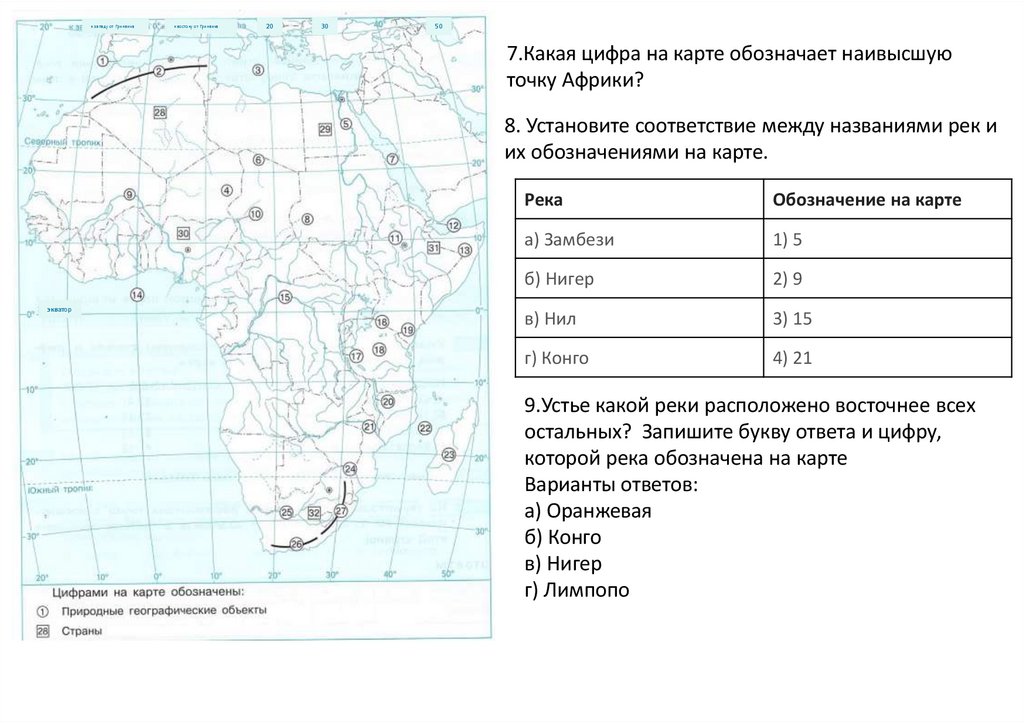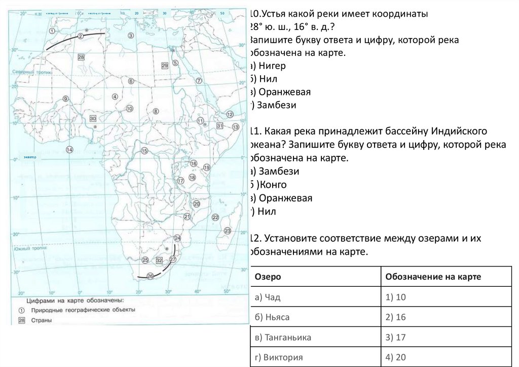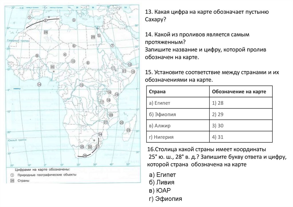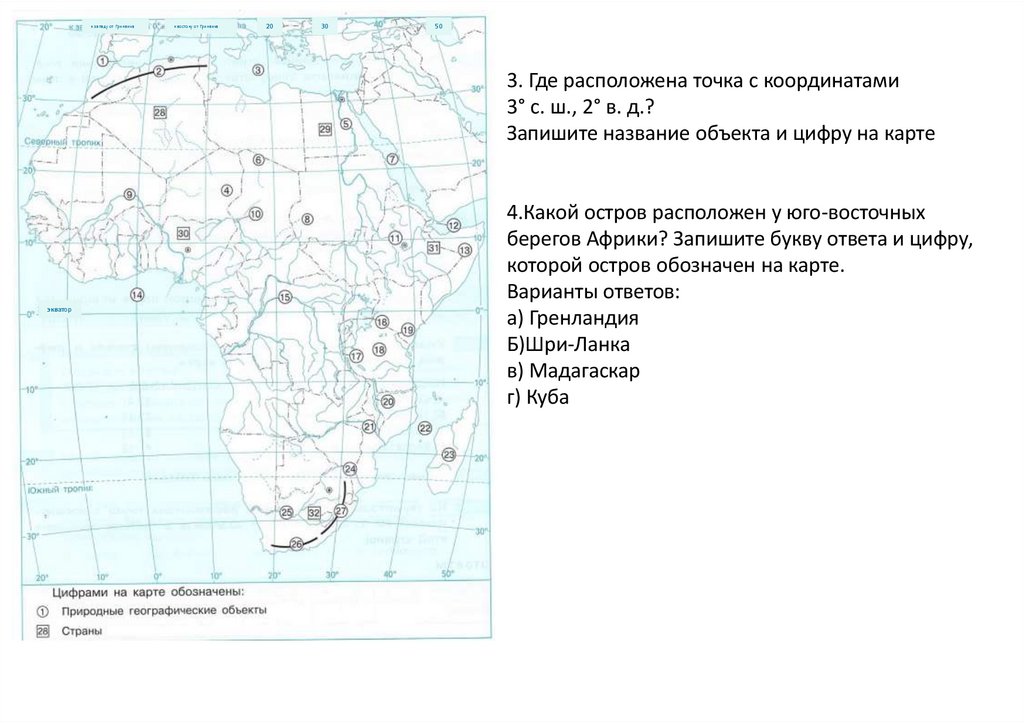 25° ю. ш., 28° в. д.? Запишите букву ответа и цифру,