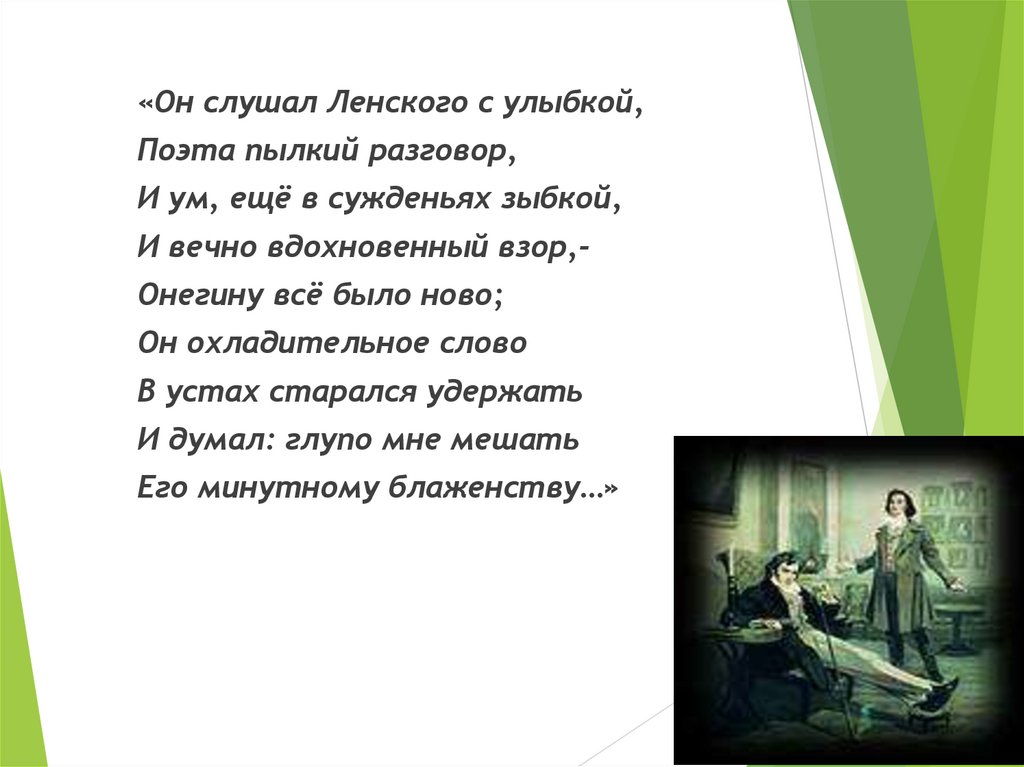 «Он слушал Ленского с улыбкой,Поэта пылкий разговор,