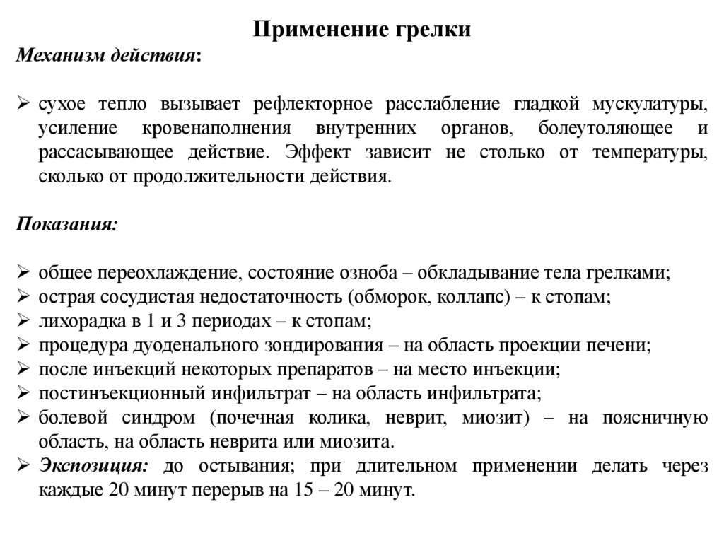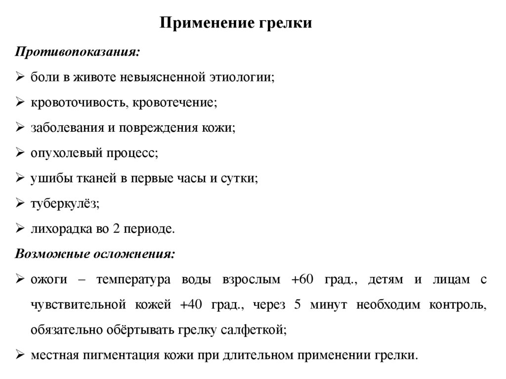12. Расскажите о показаниях и противопоказаниях к постановке грелки.