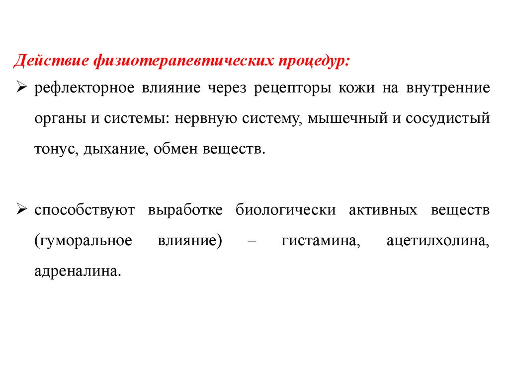 Действие физиотерапевтических процедур:рефлекторное влияние через рецепторы кожи на внутренние