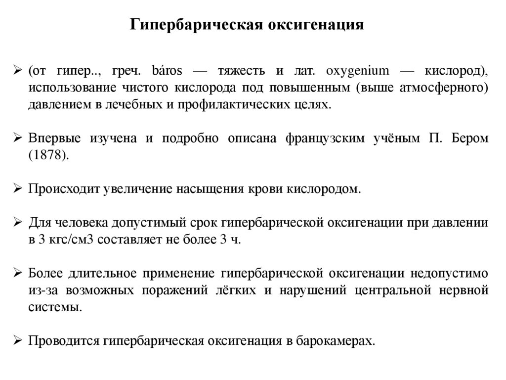 Гипербарическая оксигенация(от гипер.., греч. báros — тяжесть и лат. oxygenium — кислород),