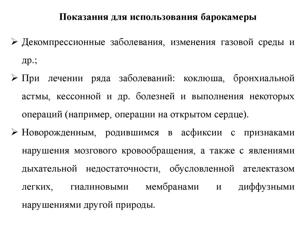 Показания для использования барокамерыДекомпрессионные заболевания, изменения газовой среды и