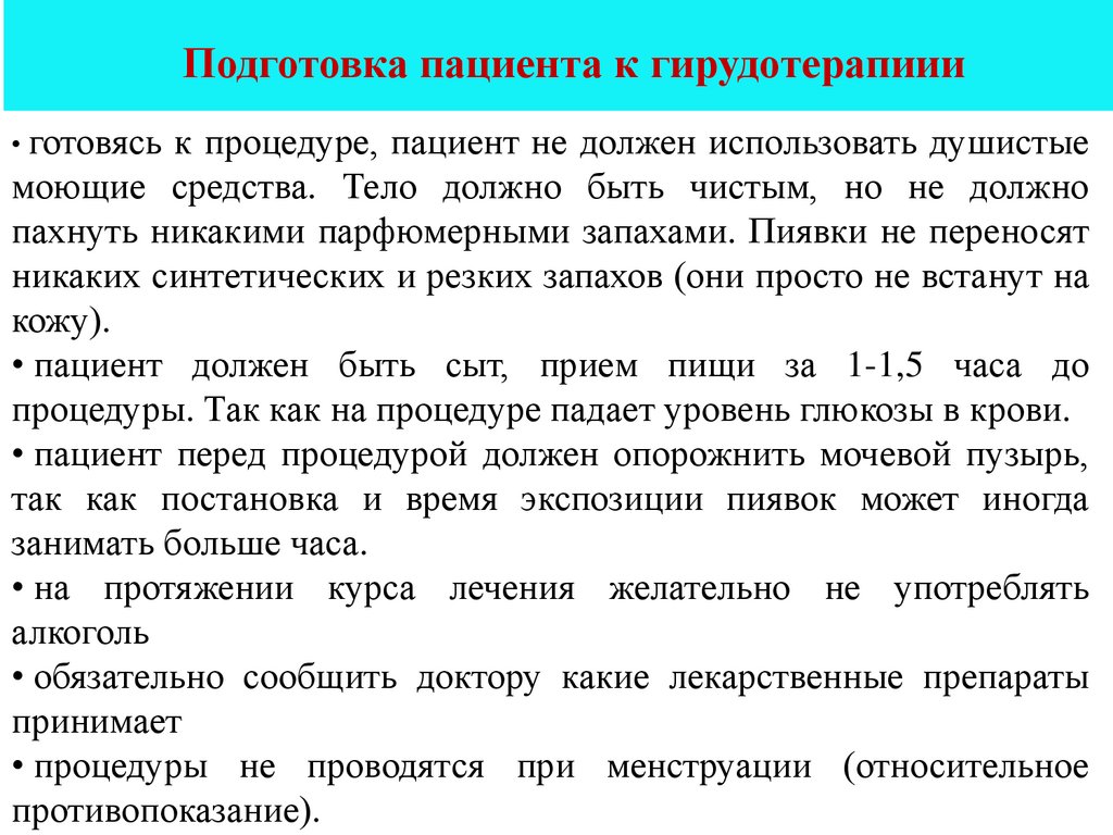 Подготовка пациента к гирудотерапиии• готовясь к процедуре, пациент не должен использовать душистые