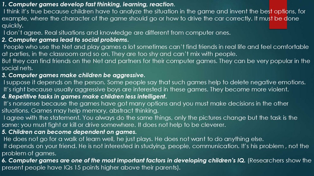 1. Computer games develop fast thinking, learning, reaction.I think it’s true because children have to analyze the situation in the game and invent the best options, for