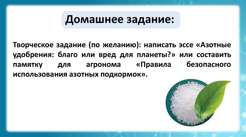 Домашнее задание:Творческое задание (по желанию): написать эссе «Азотные